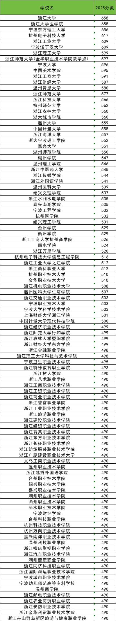 2025年浙江本科批投档线显示,浙江省内各本科高校录取分数线在490分-658分之间,本文将带来2025浙江省内各本科高校录取分数线一览表,以便各位浙江考生参考查阅。