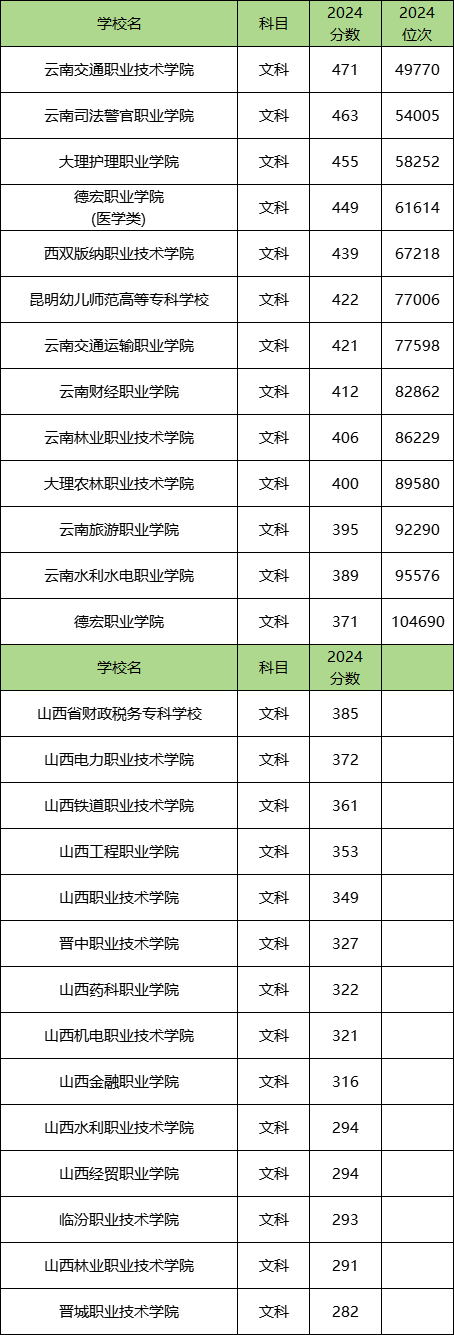 其余院校和分数线情况可在下表中查阅(依次为云南、山西):