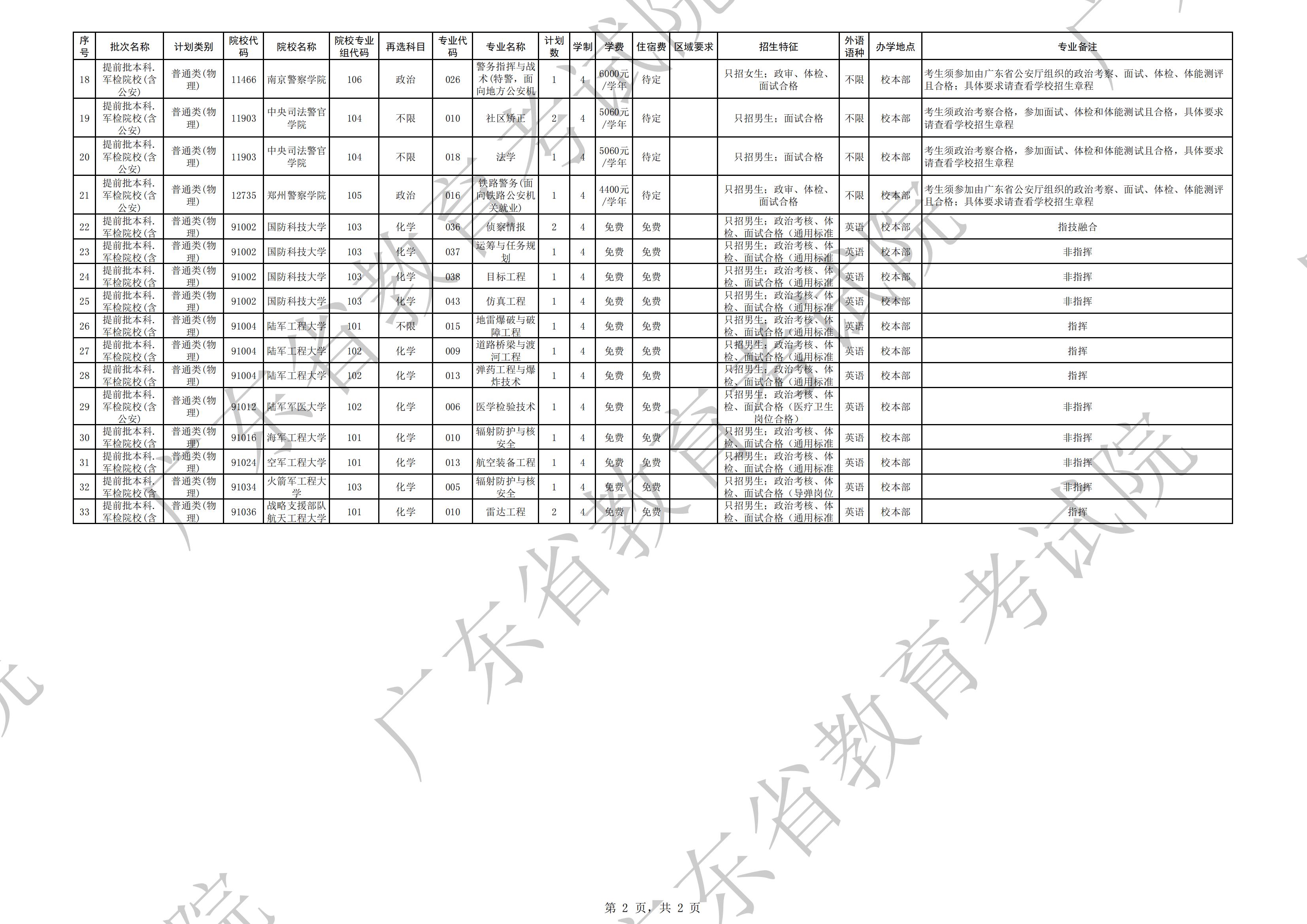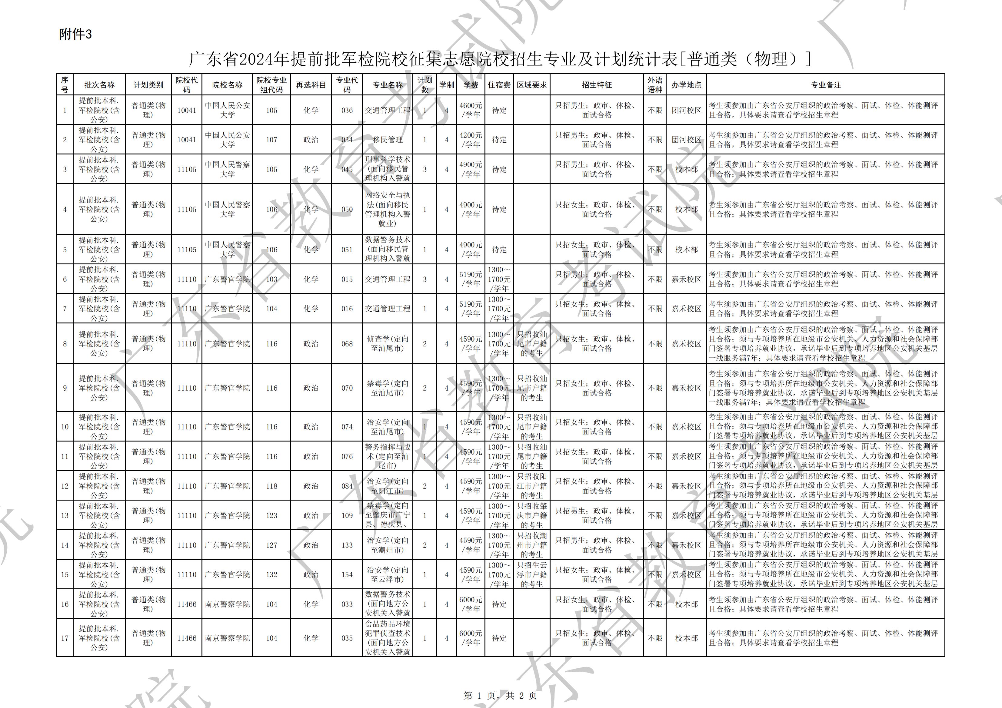 在广东提前批军检院校征集志愿(物理类)中,有中国人民公安大学、广东警官学院、中央司法警官学院、国防科技大学、陆军工程大学、空军工程大学等院校。