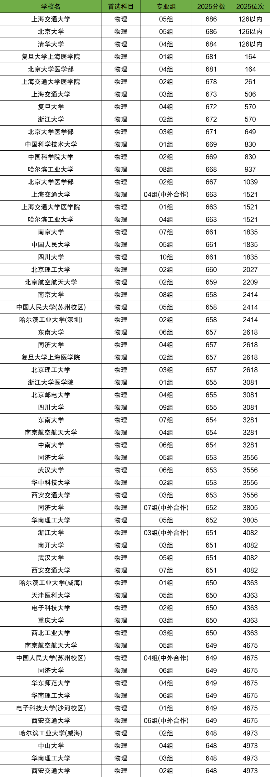 在此范围内,收分最高的是上海交通大学05组、北京大学05组,最低位次为126位以内,最低分为686分;