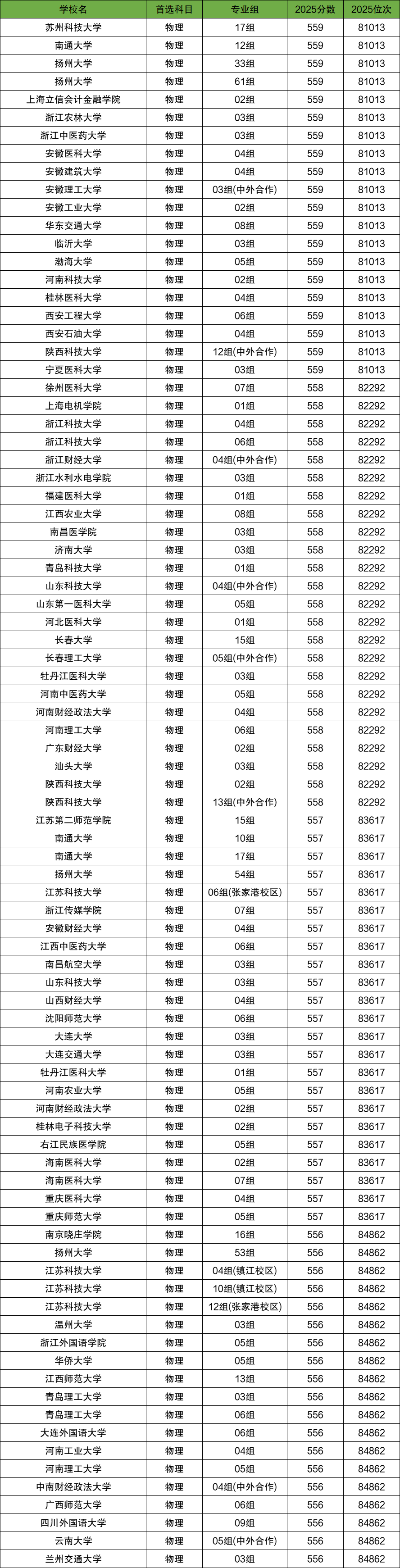 在此范围内,收分最高的是苏州科技大学17组、南通大学12组等20个院校专业组,最低位次为81013位,最低分为559分;