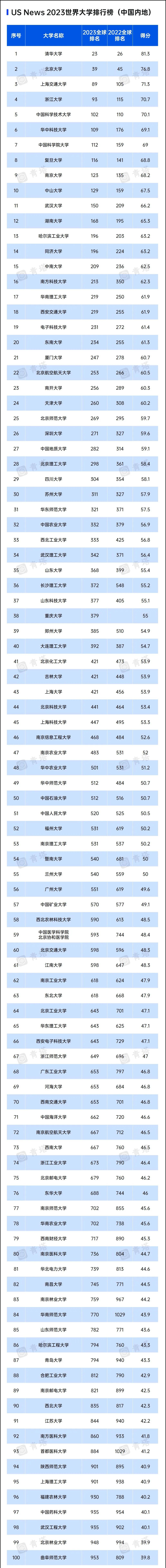 在2023USNews世界大学排名中,根据中国大学世界排名情况来看,清华大学亚洲第一,和北大的名次依旧平稳上升,清华大学排名全世界第23名,相比2022年进步3位,居内地高校第一。北京大学紧随其后,排名全世界第39名,相比去年也进步了6位。上海交通大学排名全世界第89名,居国内第三,比去年进步16位。浙江大学排名全世界第93名,国内第四,比去年进步22位。这是上海交通大学和浙江大学首次进入全球前100名。