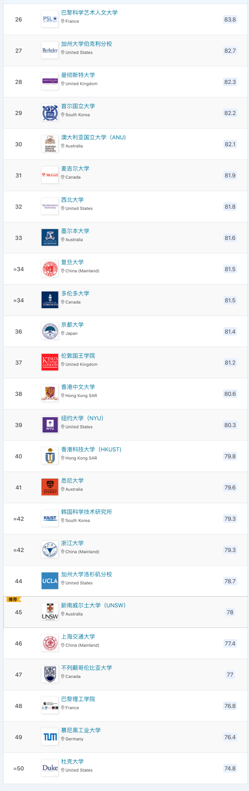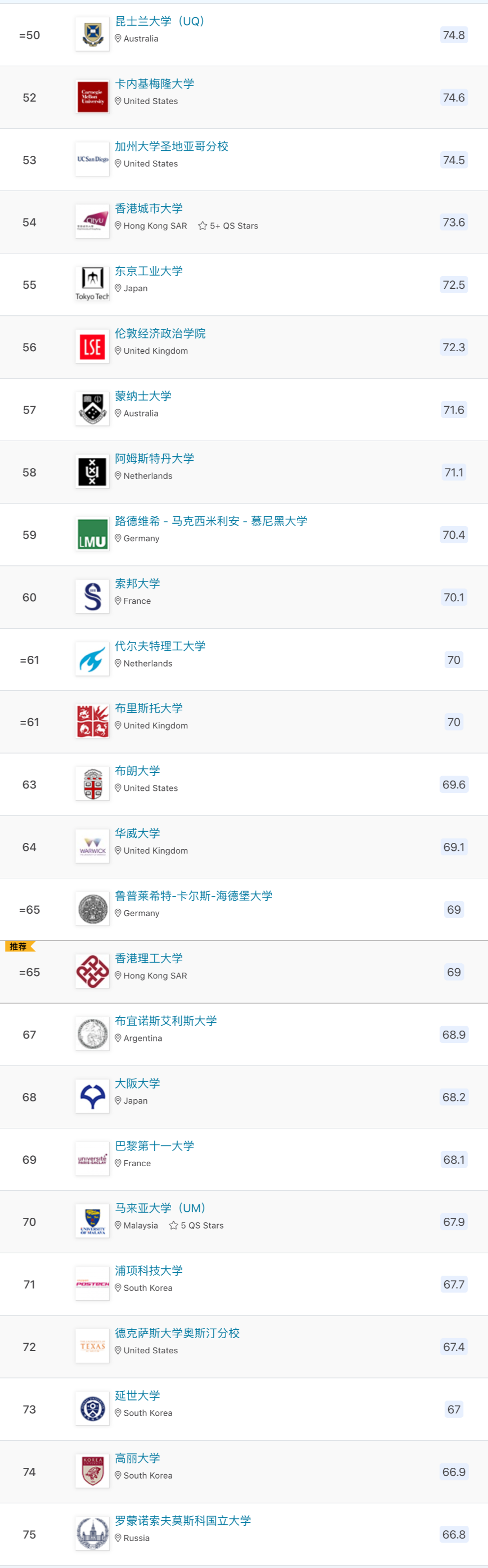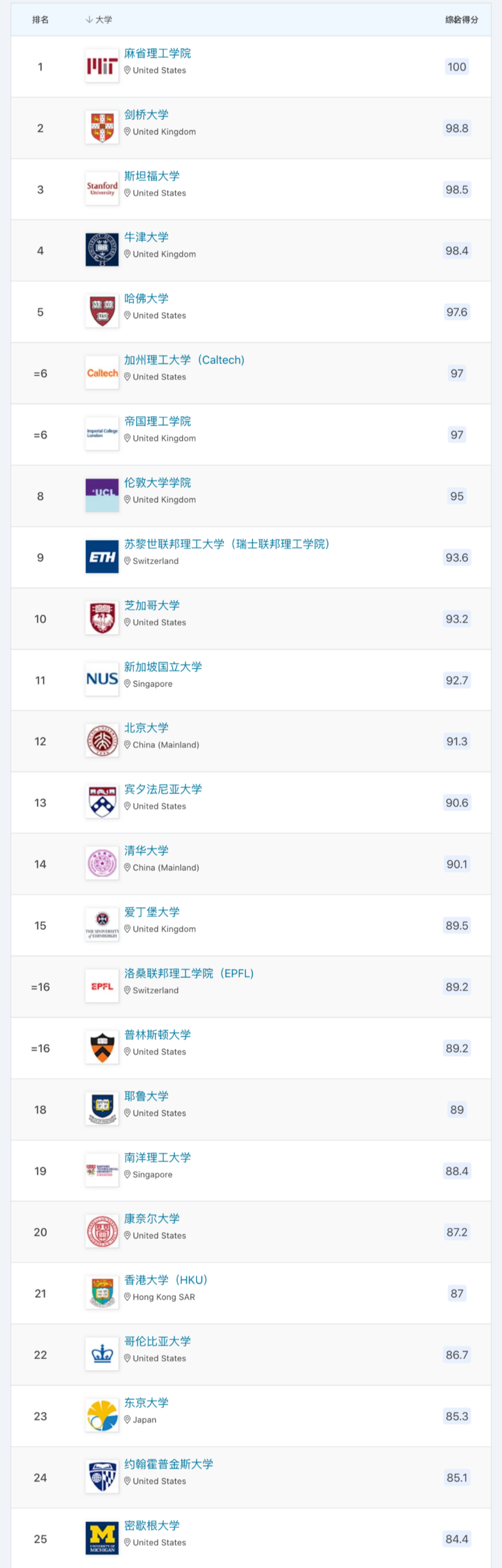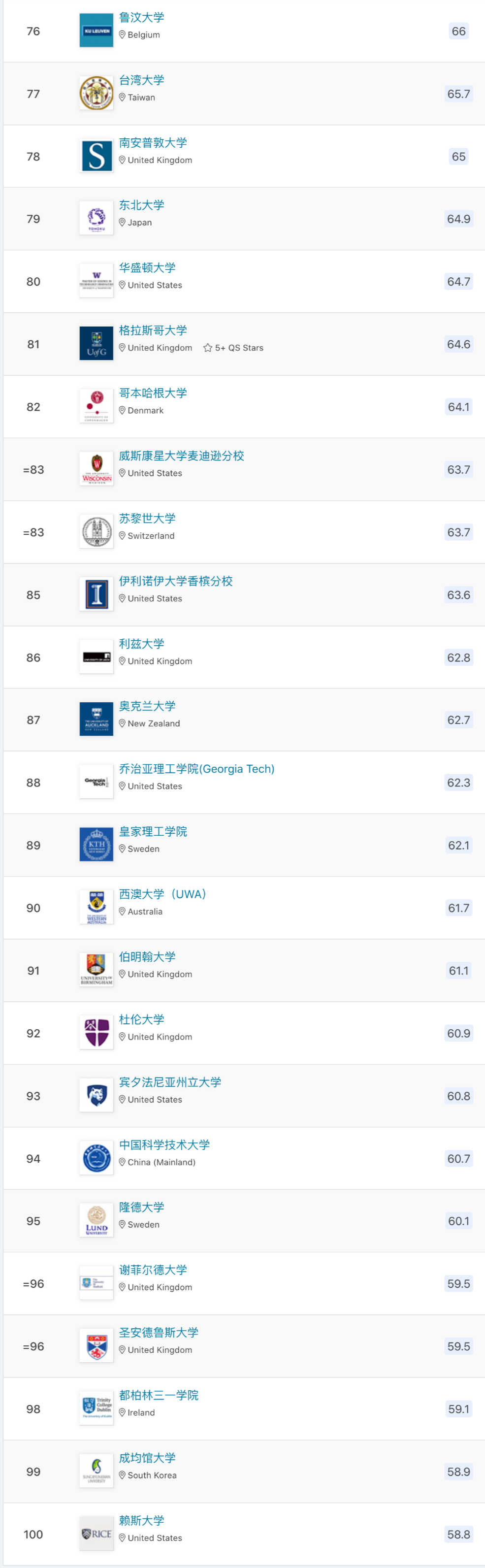 下表为2023年QS世界大学综合排名前100名(TOP100)大学完整名单,供大家参考: