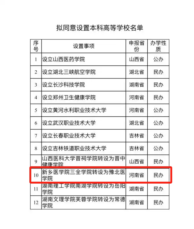 2025 年 1 月 15 日,教育部发布《关于拟同意设置本科高等学校的公示》,拟同意新乡医学院三全学院转设为豫北医学院。在教育部公布的文件中,豫北医学院为民办高校。