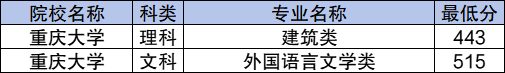 学校国家专项计划文科最低分数线是515分,对应的招生专业是外国语言文学类;理科最低分数线是443分,对应的招生专业是建筑类。