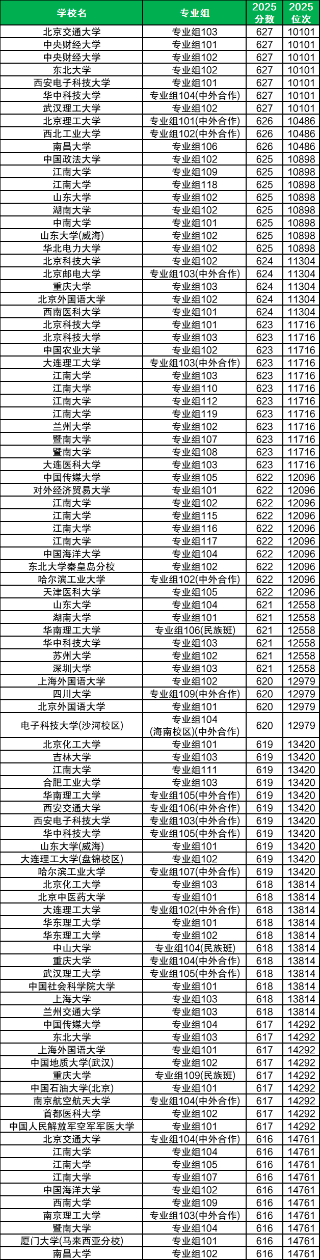 在这个范围内,录取分数线最高的是北京交通大学103组、中央财经大学101组、东北大学102组等7个院校专业组,最低位次为10101位,最低分为627分; 录取分数线最低的是南昌大学102组、厦门大学(马来西亚分校)101组、暨南大学104组等10个院校专业组,最低位次为14761位,最低分为616分。