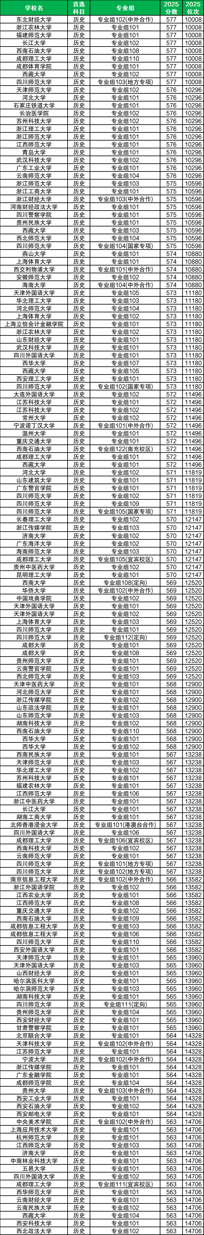 根据国内各个高校在四川省历史类的招录数据可知,2025年四川省高考历史类成绩在10000名到15000名之间的考生能上的学校有101所、156个专业组,对应的分数为563分~577分。