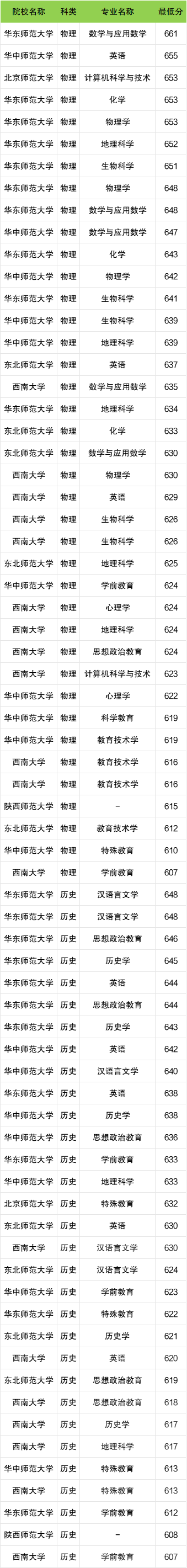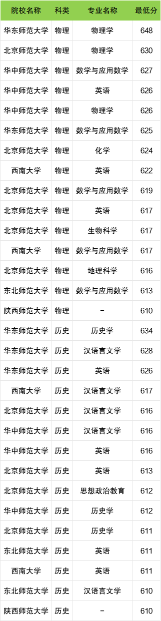 最低分对应院校及专业为:历史类东北师范大学汉语言文学专业、陕西师范大学(610分)、物理类陕西师范大学(610分)。