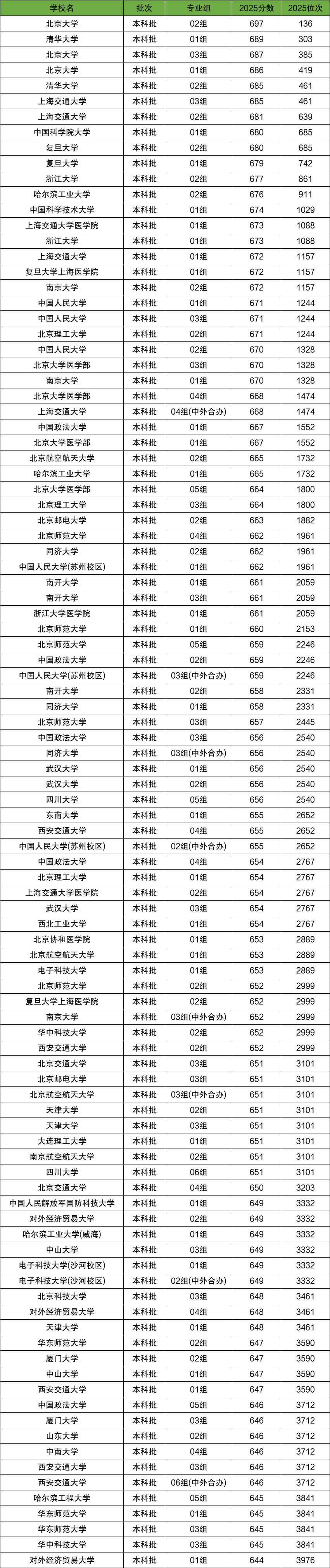 下面是2025年在北京市录取分数线及位次排名前百强高校一览表: