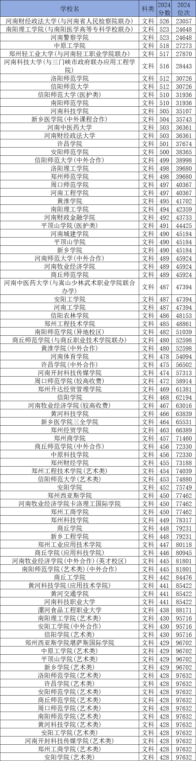 以下为2024年河南文科所有二本大学分数线(可滑动查看):