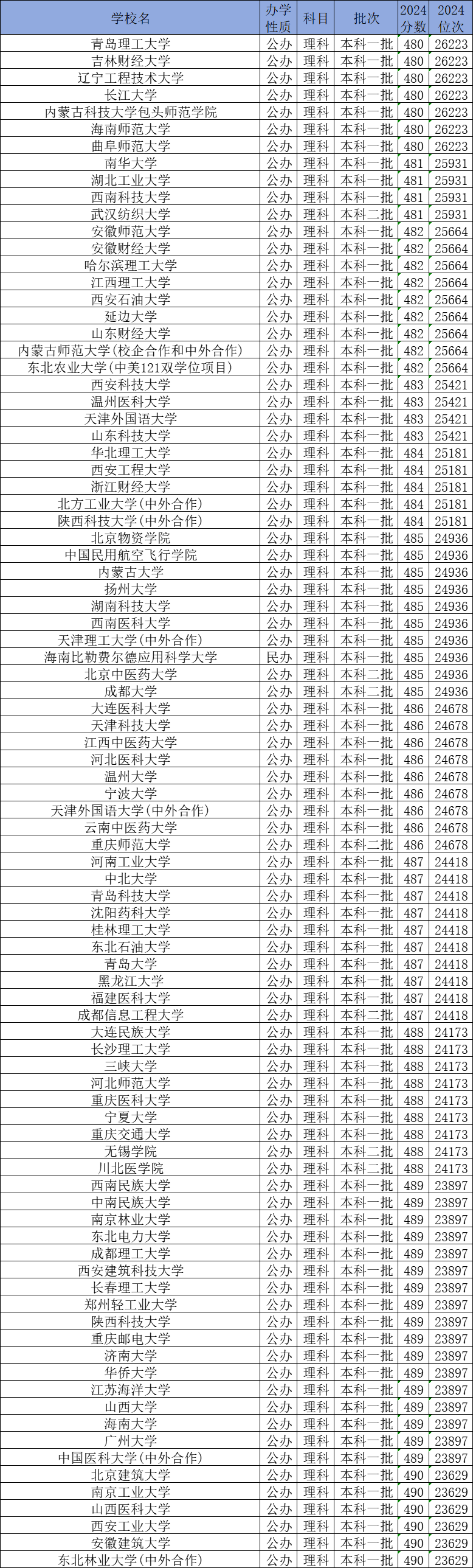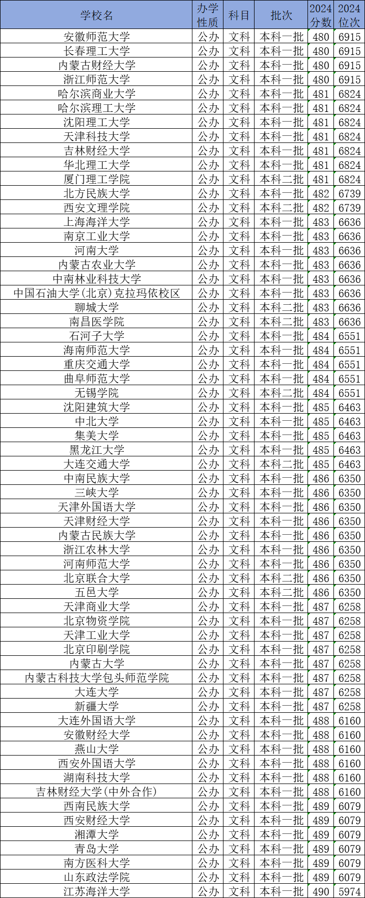 各省480分到490分的大学名单不同,本文以内蒙古为例,分别整理文科、理科录取分数线位于480-490分的大学。