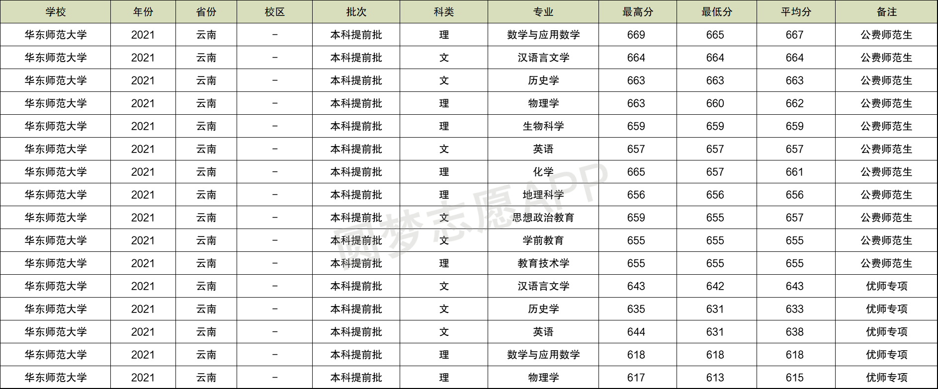 2021年华东师范大学公费师范生在云南的最低分数线为:文科:631分;理科:613分。
