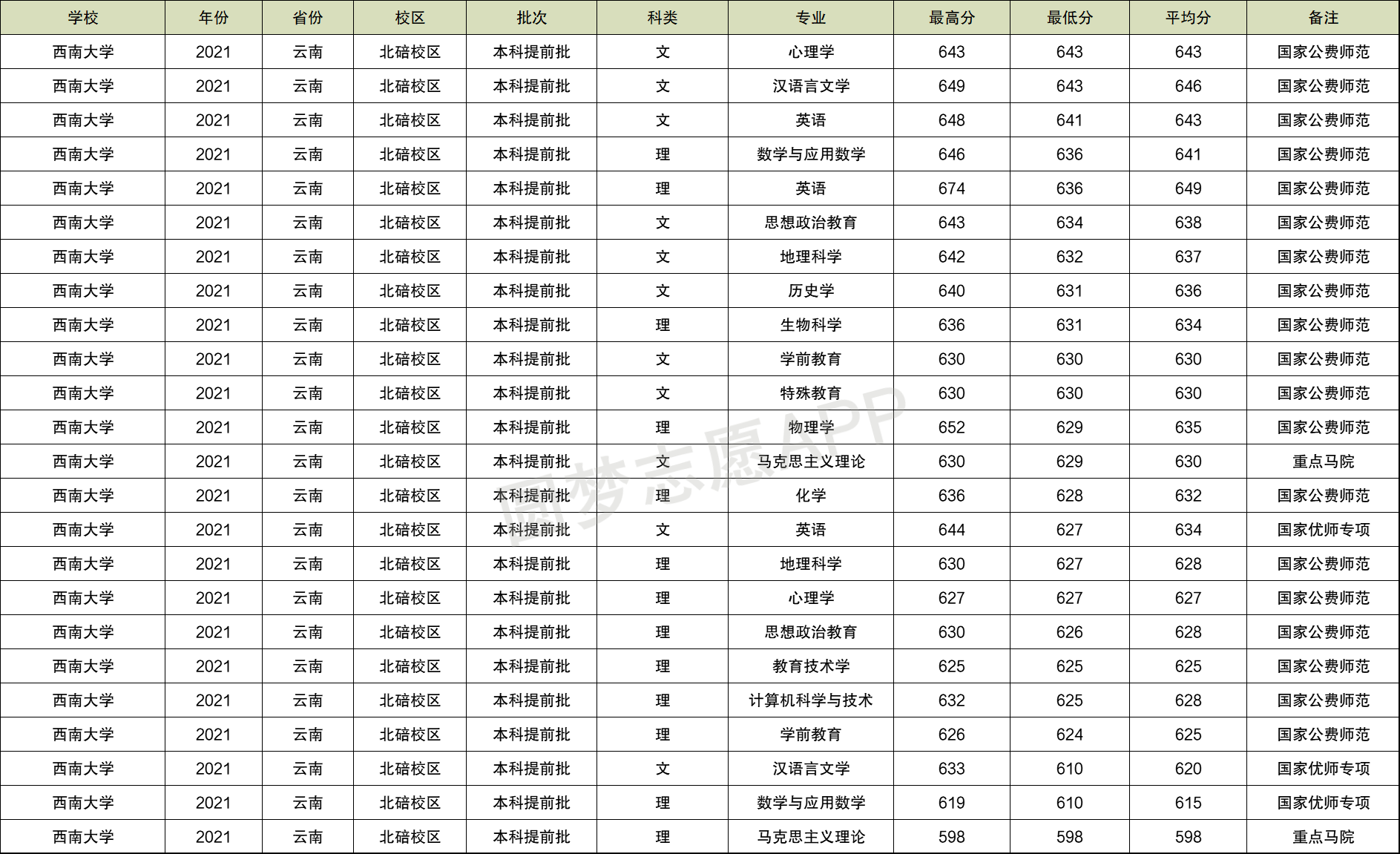 2021年西南大学公费师范生在云南的最低分数线为:文科:610分;理科:598分。
