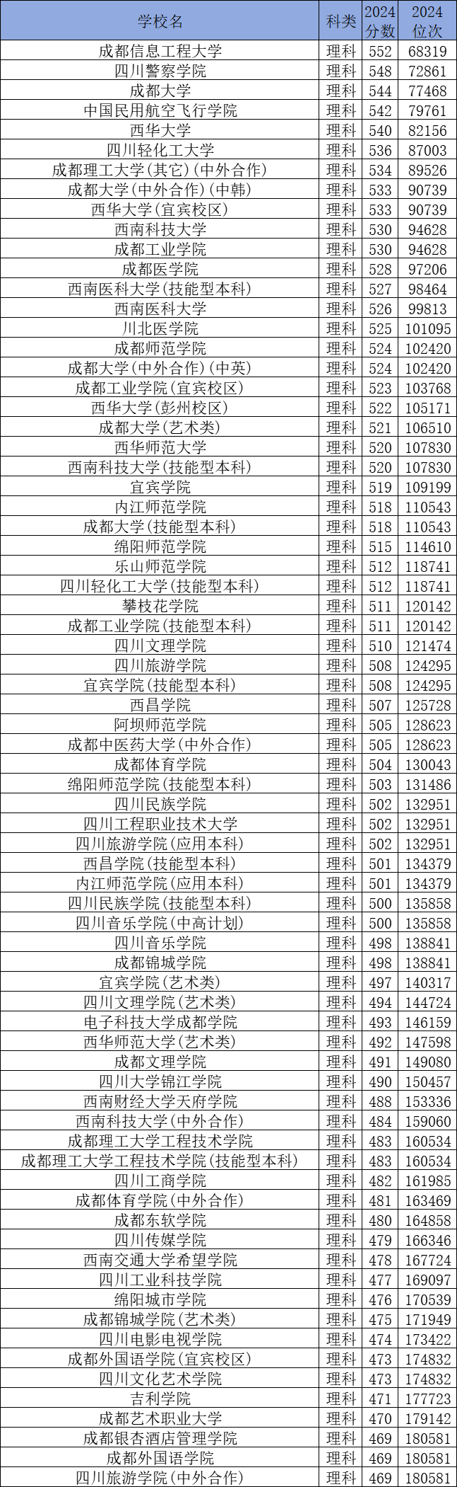 以下为2024年四川理科所有二本大学分数线(可滑动查看):