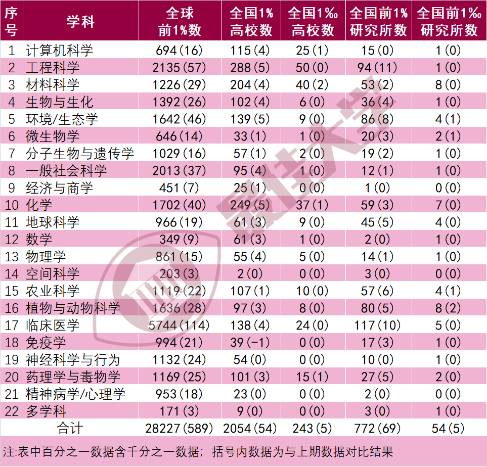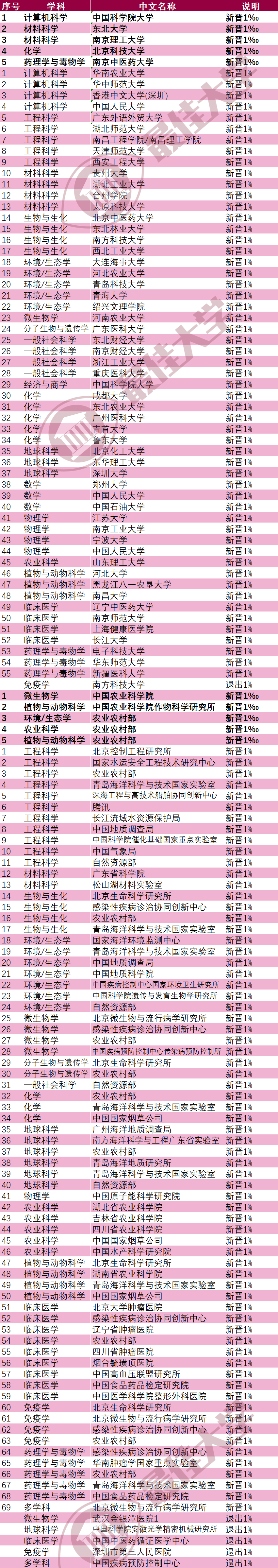 全国高校共54个学科新晋升全球前1%,包括深圳大学的地球科学、郑州大学的数学学科、中国农业科学院的微生物学科、华南农业大学的计算机科学、广东外语外贸大学的工程科学、南方科技大学的生物与生化、广东医科大学的分子生物与遗传学、广州医科大学的化学等。