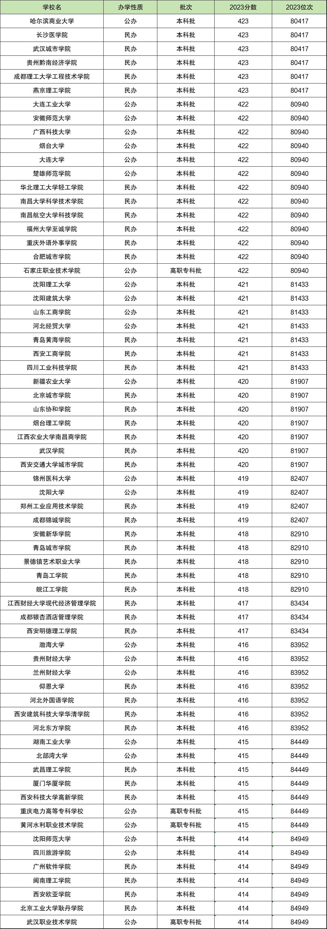 在这个范围内,收分最高的是哈尔滨商业大学、长沙医学院等6所院校,最低位次为80417位,分数线为423分;