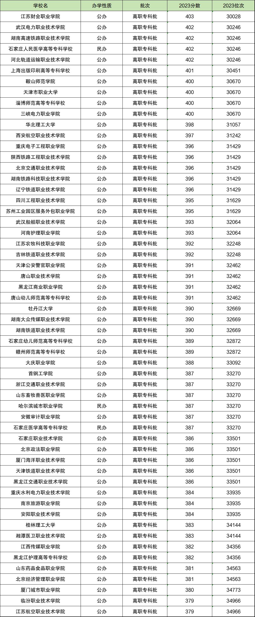 收分最低的是江苏航空职业技术学院、临汾职业技术学院2所院校,最低位次为34966位,分数线为379分。
