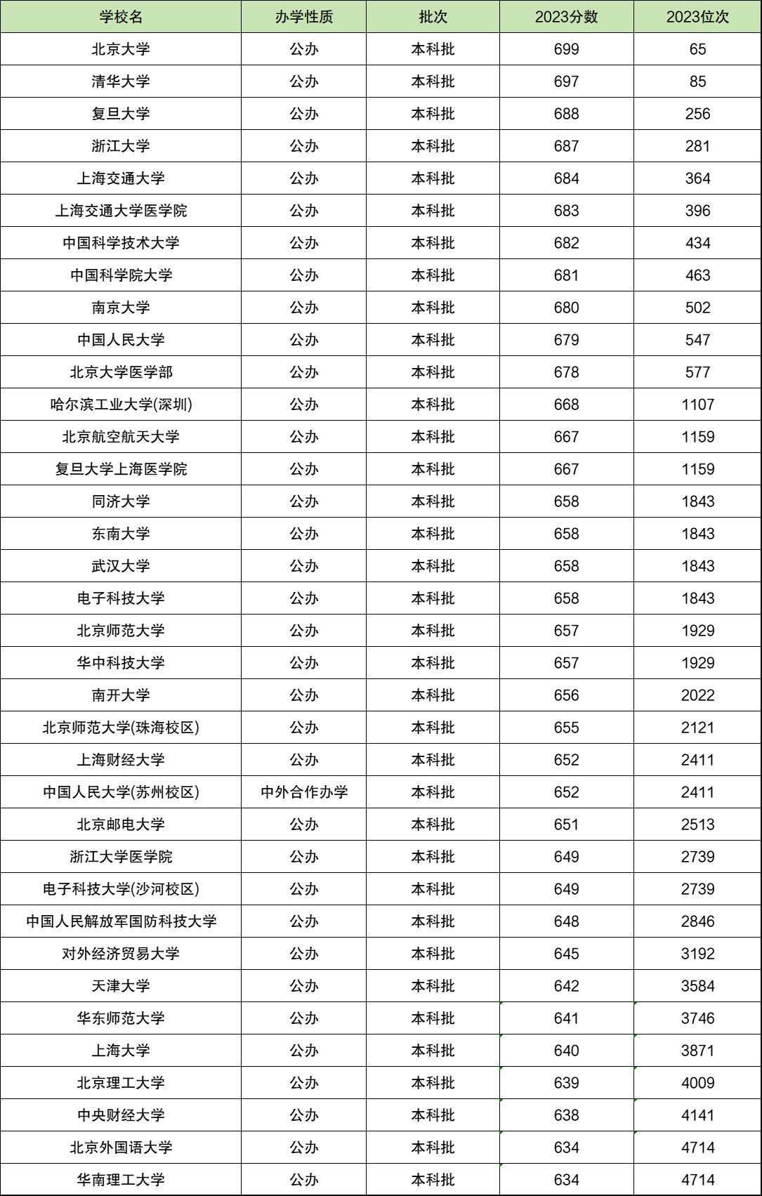在这个范围内,收分最高的是北京大学1所院校,最低位次为65位,分数线为699分;