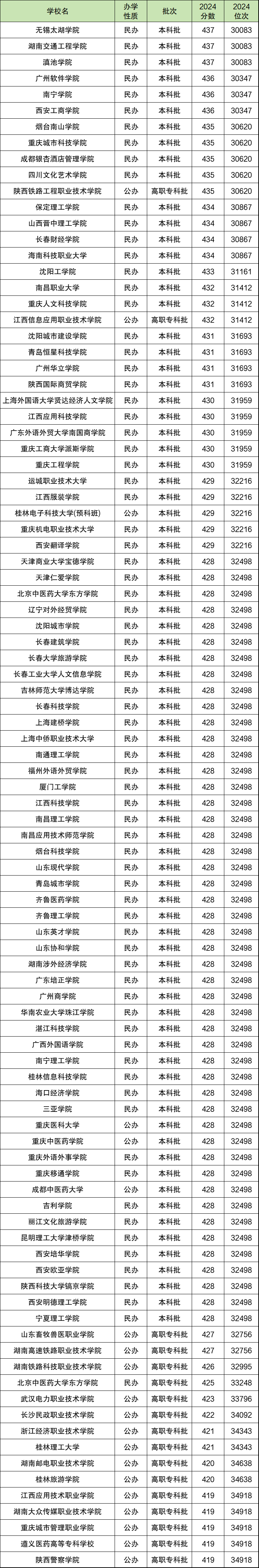 在这个范围内,收分最高的是无锡太湖学院、湖南交通工程学院等3所院校,最低位次30083位,分数线为437分;