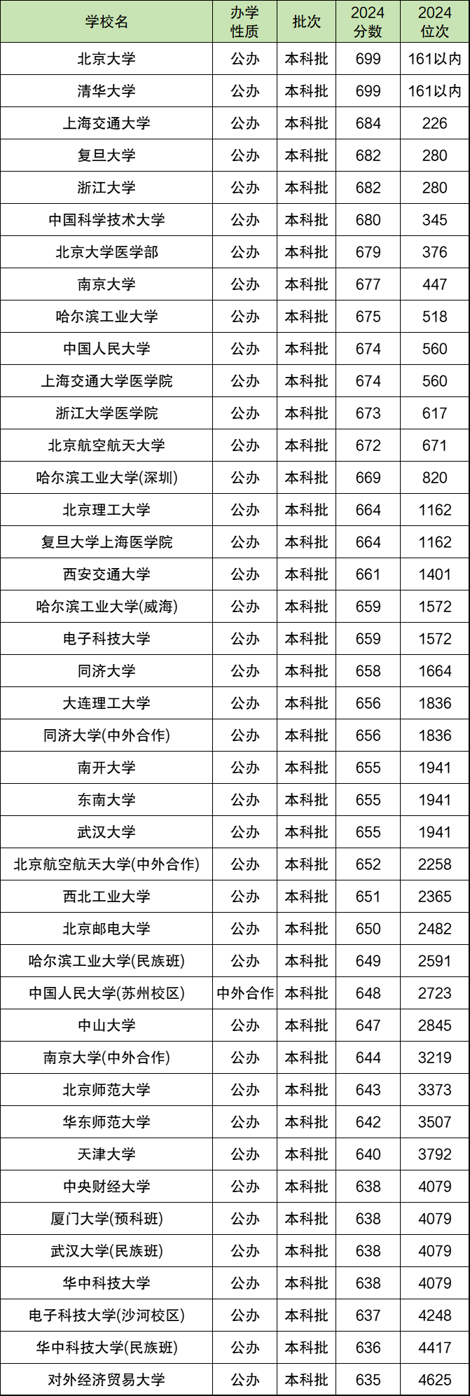 在这个范围内,收分最高的是清华大学和北京大学2所院校,最低位次为161位以内,分数线为699分;
