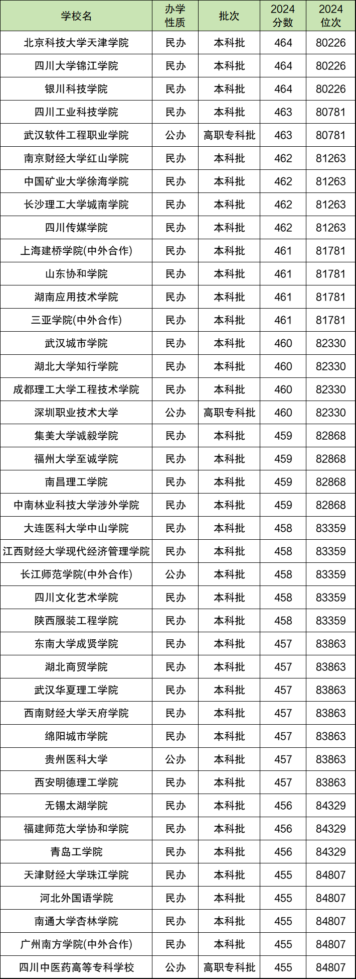 在这个范围内,收分最高的是北京科技大学天津学院、四川大学锦江学院等3所院校,最低位次为80226位,分数线为464分;