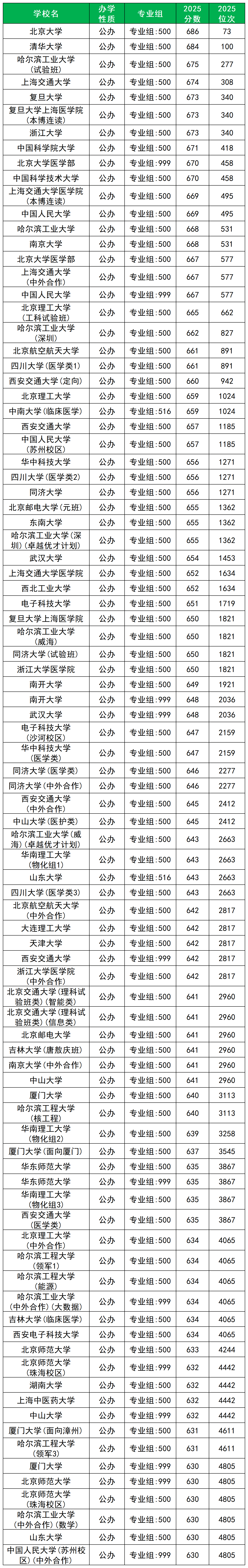 收分最低的是厦门大学999组、北京师范大学999组等6个院校专业组,最低位次为4805位,最低分为630分。