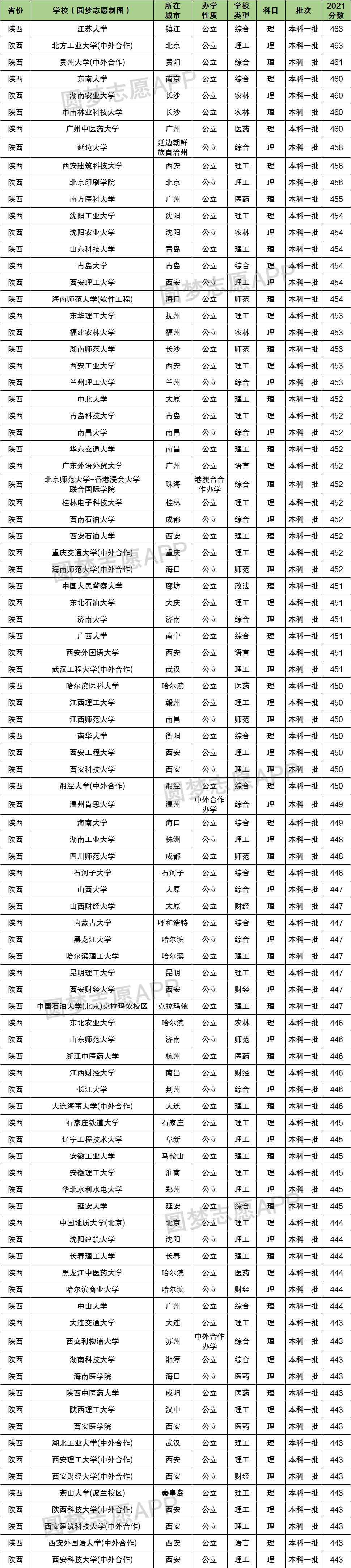 ①陕西理科:燕山大学(波兰校区) ( 443 分 )、陕西科技大学(中外合作) ( 443 分 )、西安建筑科技大学(中外合作) ( 443 分 )、西安外国语大学(中外合作) ( 443 分 )、西安科技大学(中外合作) ( 443 分 )。