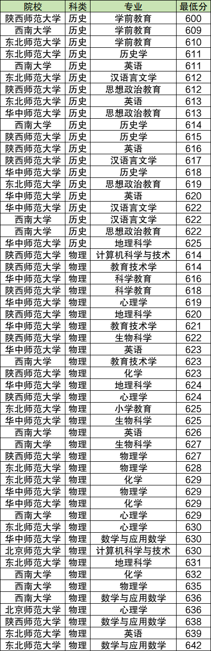 黑龙江国家公费师范生录取分数线是历史类最低600分,招生院校及专业是陕西师范大学学前教育专业;物理类最低614分,招生院校及专业是陕西师范大学计算机科学与技术专业和教育技术学专业。