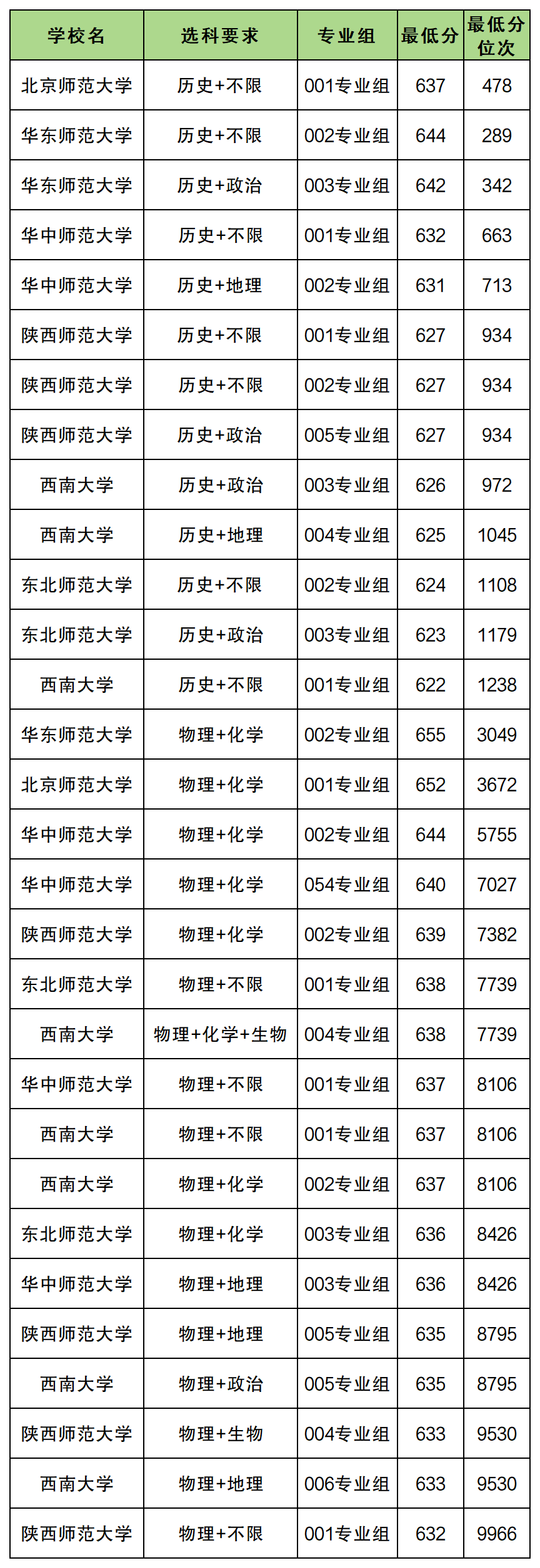 安徽国家公费师范生院校专业组中物理类录取分数线最低的是陕西师范大学001专业组,2025年的最低分数线为632分,最低位次9966位。