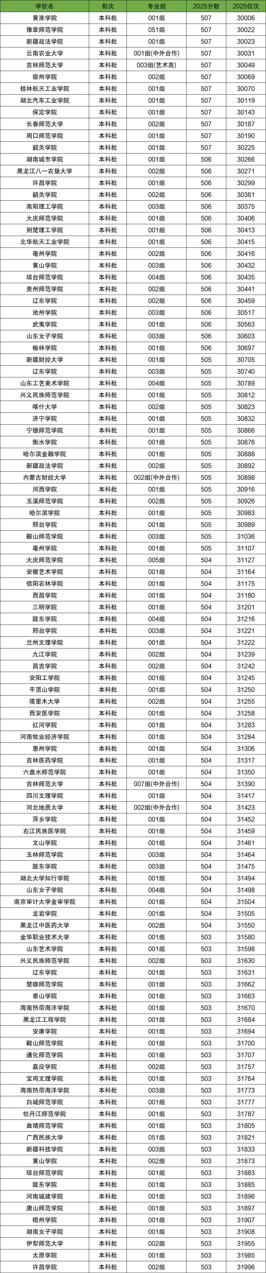 在这个范围内,录取分数线最高的是黄淮学院001组、豫章师范学院051组、新疆政法学院001组等12个院校专业组,最低分为507分;