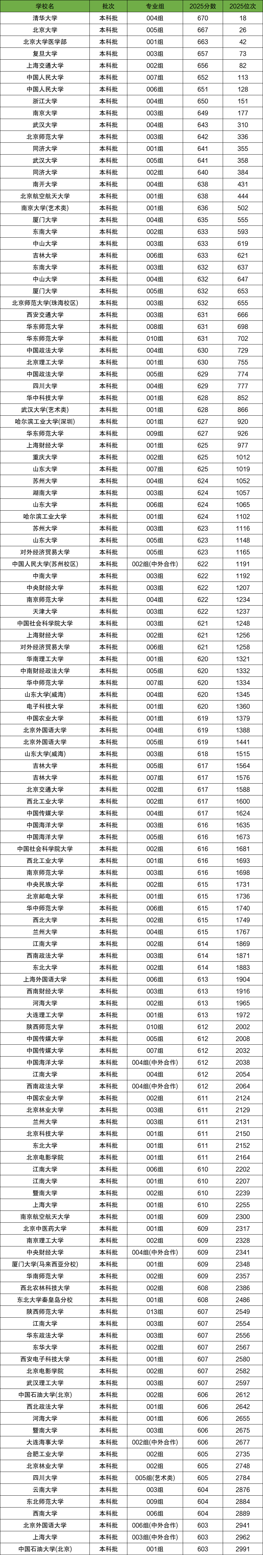 在这个范围内,录取分数线最高的是清华大学004组,最低位次18位,最低分为670分;