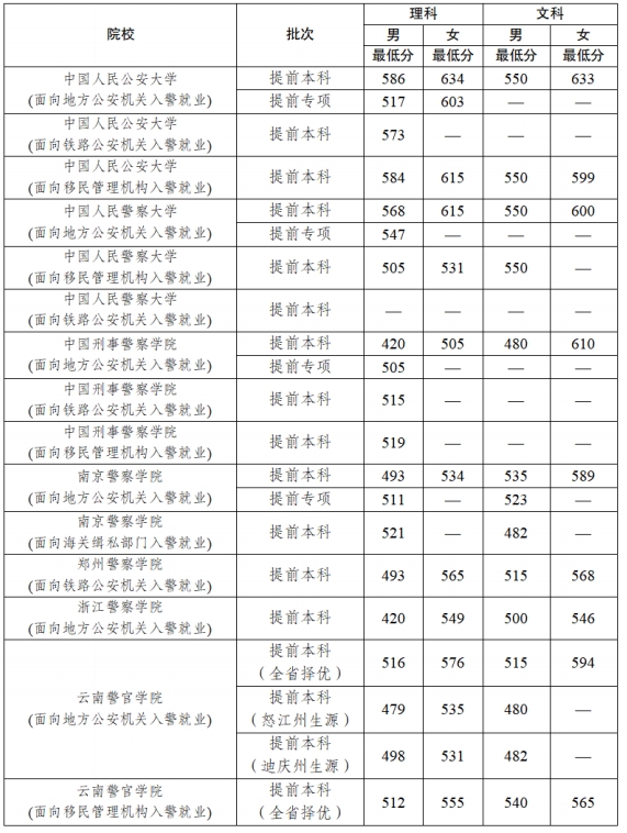 中国人民公安大学:面向地方公安机关入警就业550分(专项517分)、面向铁路公安机关入警就业573分、面向移民管理机构入警就业550分。