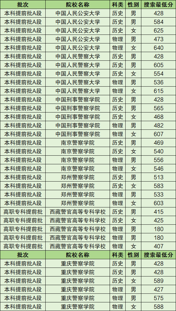 专科警校最低分:历史类男415分、女425分;物理类男180分、女407分。专科提前批录取的警校只有西藏警官高等专科学校。