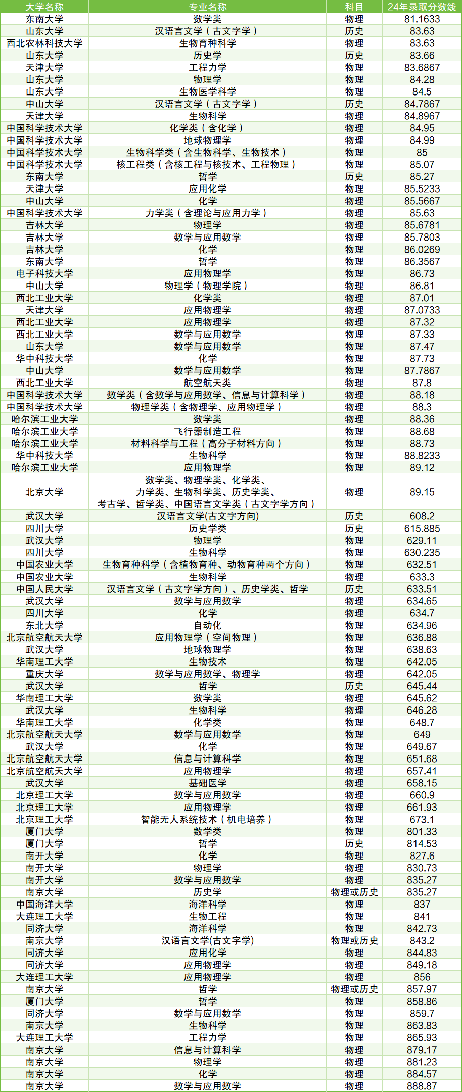 2024年全国强基计划大学录取分数线在81.16分~888.87分之间,招生专业共计40个,其中分数超860分、录取难度较大的专业如下: