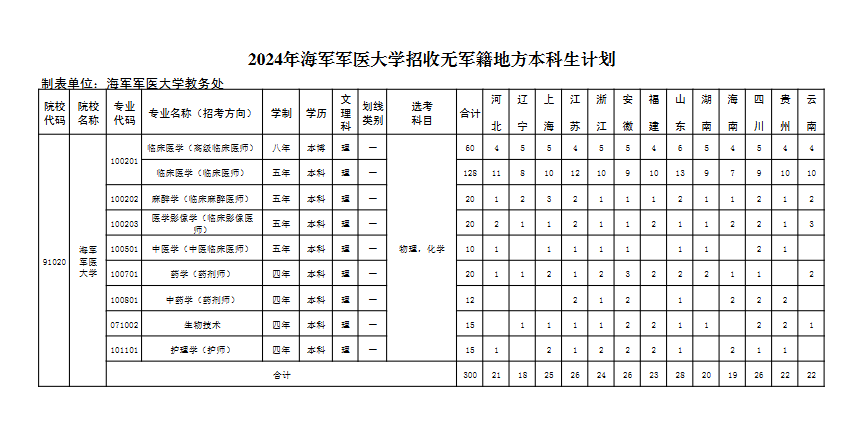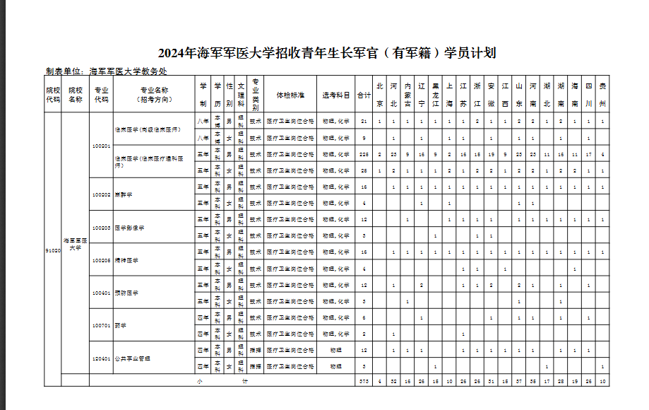 2025年海军军医大学生计划暂未出炉,本文会在官方信息公布后及时收集更新内容。下面附上2024年招生计划信息,暂供参考: