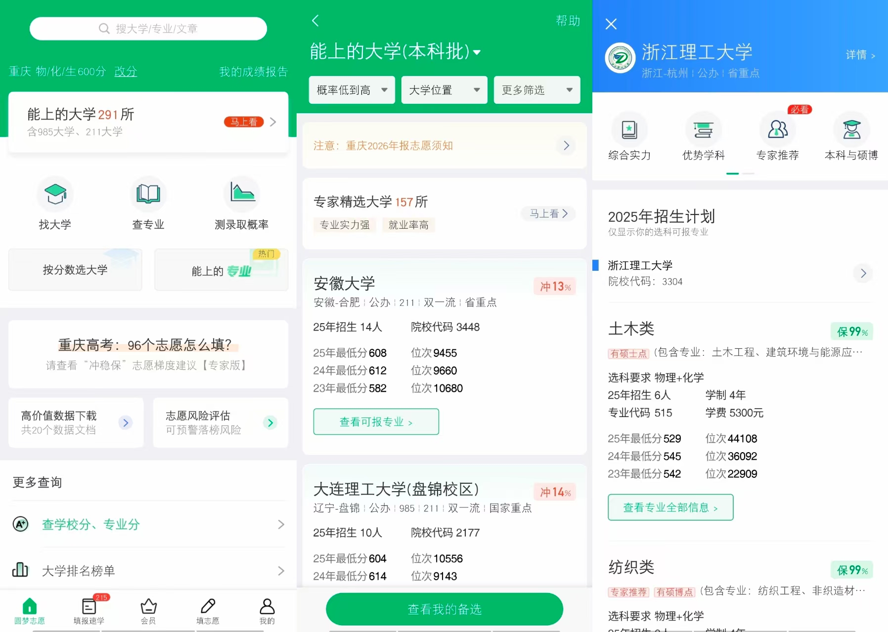 考生和家长在下载圆梦志愿APP后,只需输入考生的分数,进入首页就可以直接查看到考生的分数能上多少所院校。以重庆物化生600分的考生举例,在首页就可直接看到重庆物化生考生这个分数能上291所大学。