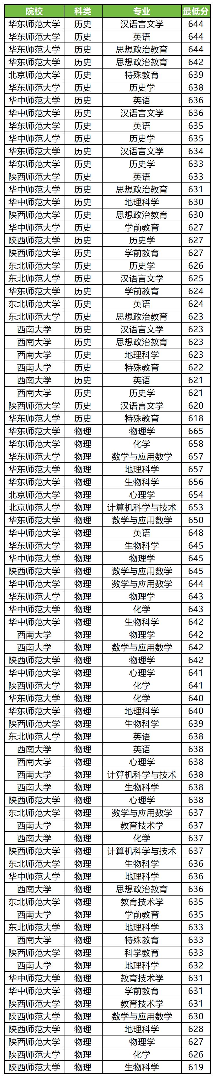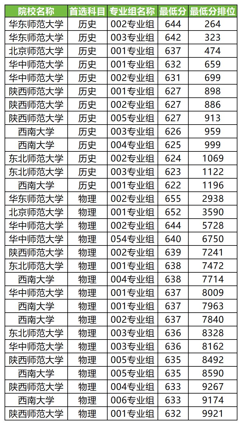 2025年录取分数线最高的是华东师范大学002组,最低655分,位次2938名;另外分数线排在前五的还有北京师范大学和华中师范大学的专业组,进入前十的还有华中师范大学054组、陕西师范大学002组、东北师范大学001组、西南大学004和北京师范大学001组。这些院校专业组的最低分均在637分及以上。