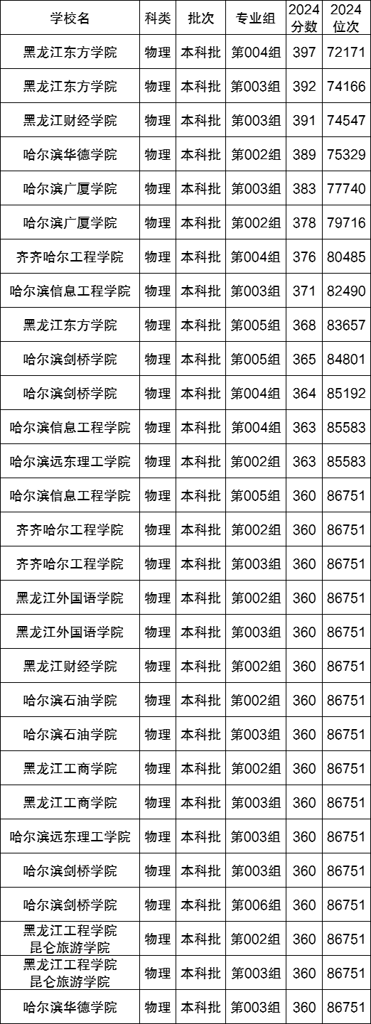 下面是2024年各黑龙江的民办本科大学在黑龙江省物理类的录取分数线