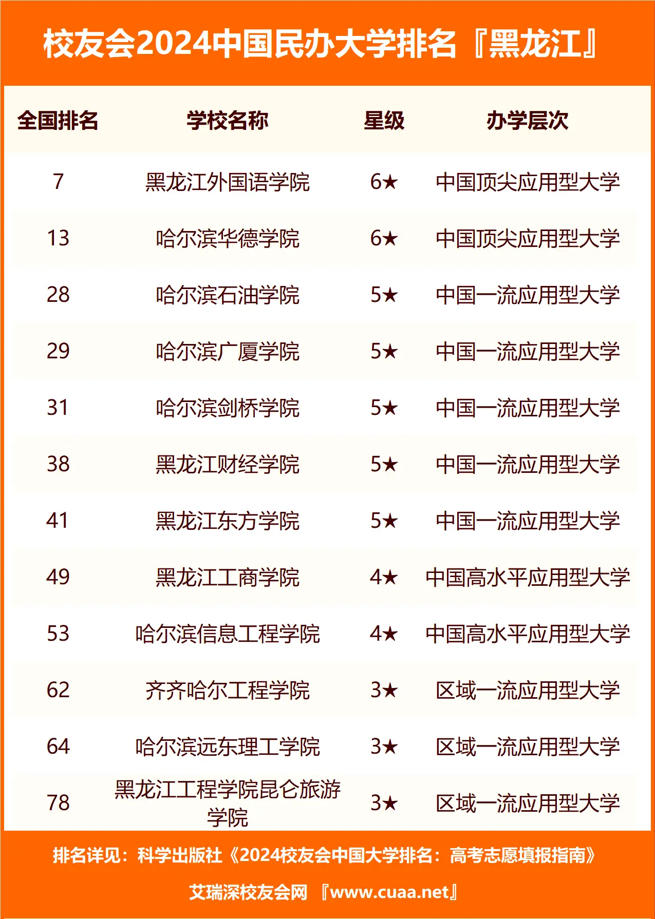 根据校友会2024年黑龙江的民办本科大学排名表,可以得知国内排名前10的黑龙江的民办本科大学分别是: