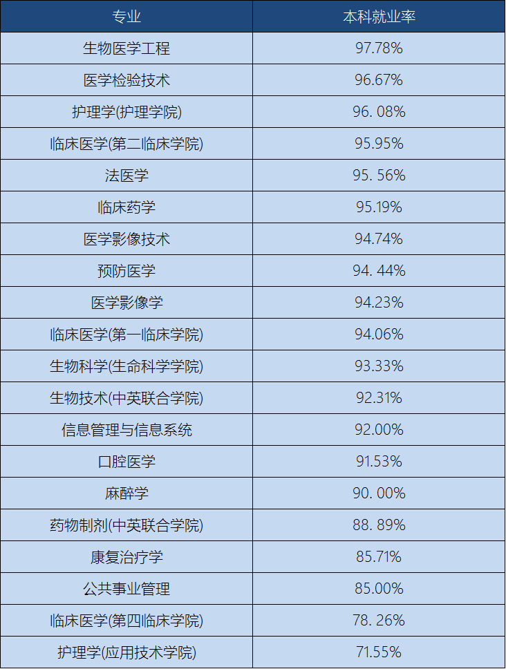 2019届本科毕业生分布于学校的20个专业中,其中生物医学工程的就业率最高,具体为97.78%,应用技术学院的护理学就业率最低,具体为71.55%,详细的情况如下: