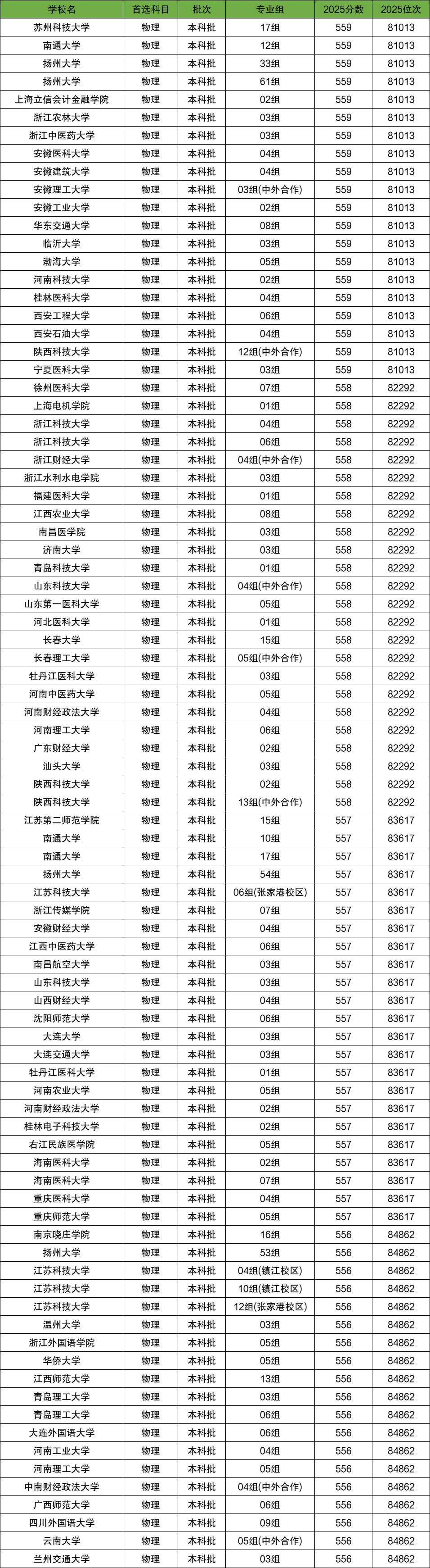 江苏物理组8万-8.5万名对应的院校专业组一共有86个,在此范围内,最高位次对应的院校专业组有苏州科技大学17组、南通大学12组、扬州大学33组等20个,最低录取位次为81013位,位次对应分数为559分;