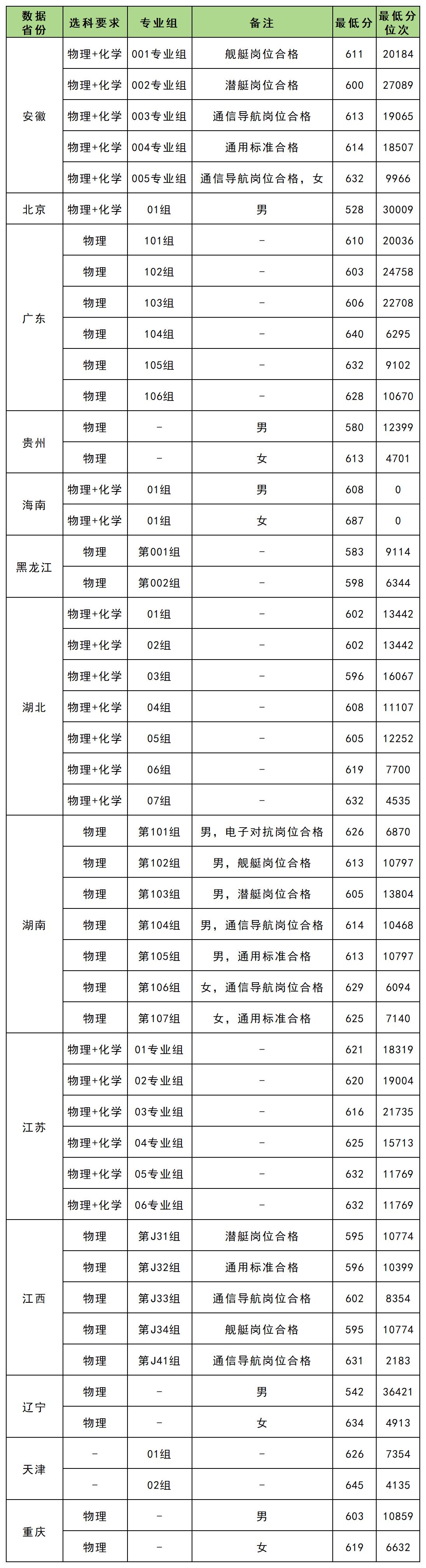 海军工程大学在湖南提前批是分专业组、分性别进行的招生,只招收物理科目组考生,具体各专业组的投档分数线为: