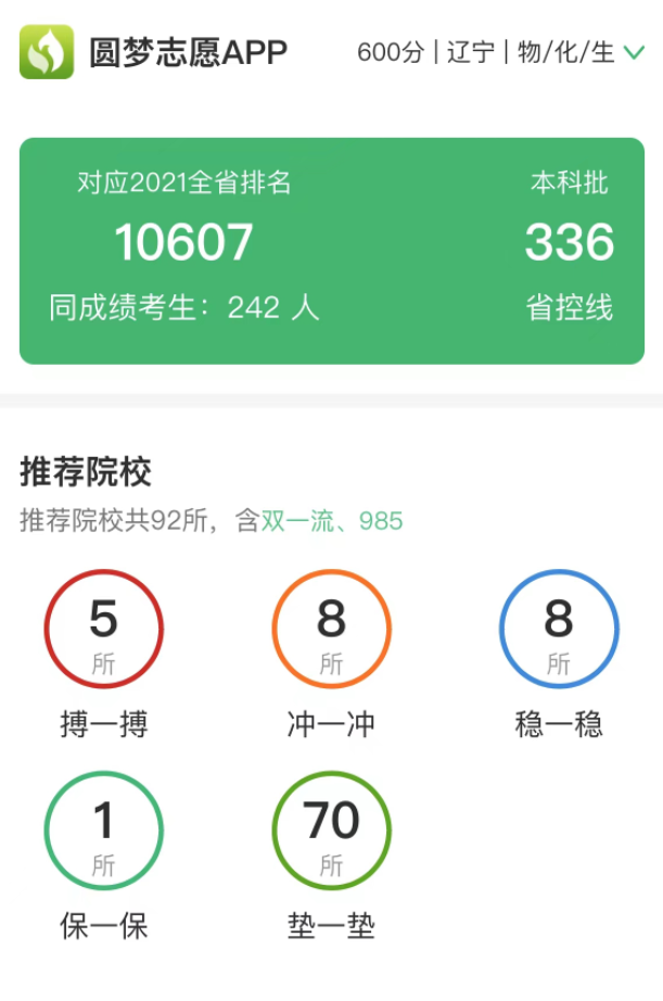 以下为辽宁省高考“搏冲稳保垫”对应大学的录取概率:
