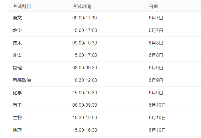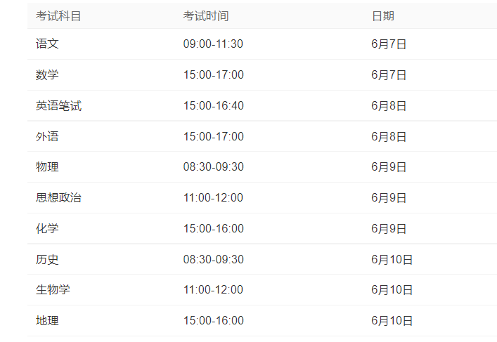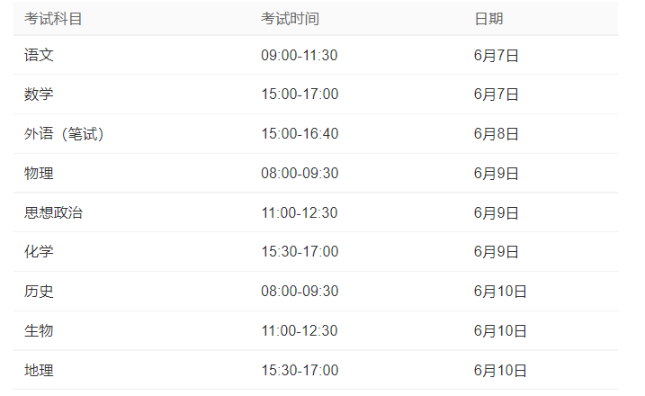 新疆是在以下考试安排的基础上,多了一项民族语文考试,考试具体时间是在6月9日的9:00-11:30