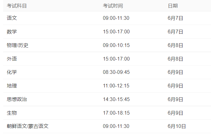 黑龙是在以下考试安排的基础上,多了一项朝鲜语文/蒙古语文考试,考试具体时间是6月9日9:00—11:30