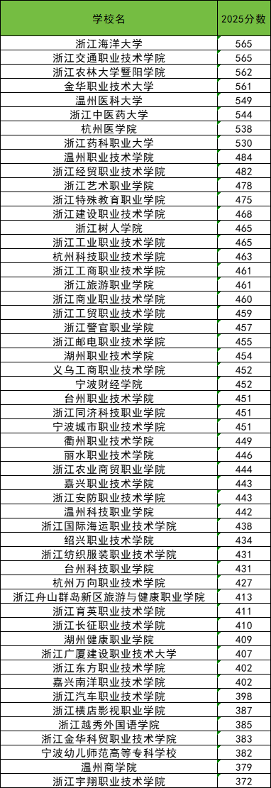 下面是2025年浙江省内专科高校录取分数线一览表: