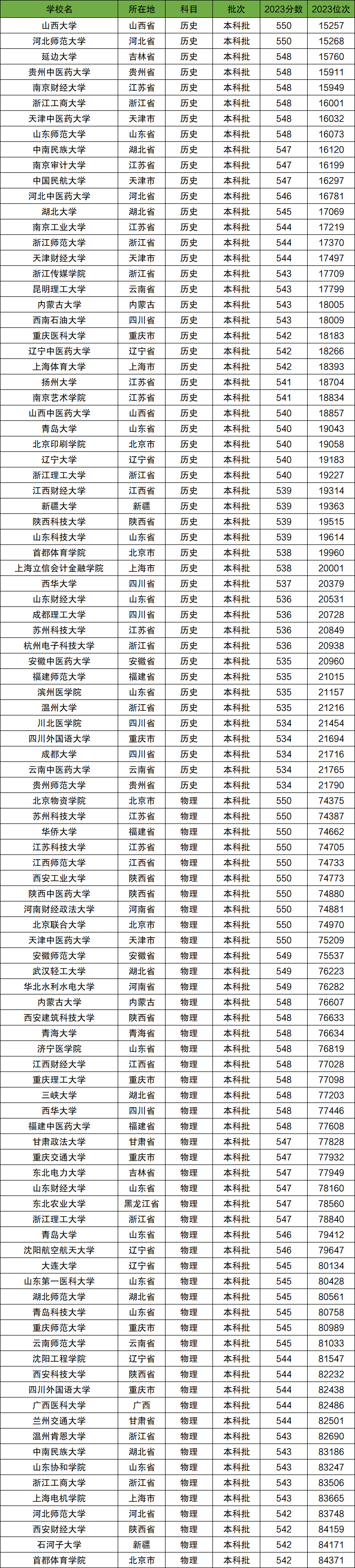 历史类共计261所,物理类共计379所,本文篇幅有限,上表只列举100所大学。