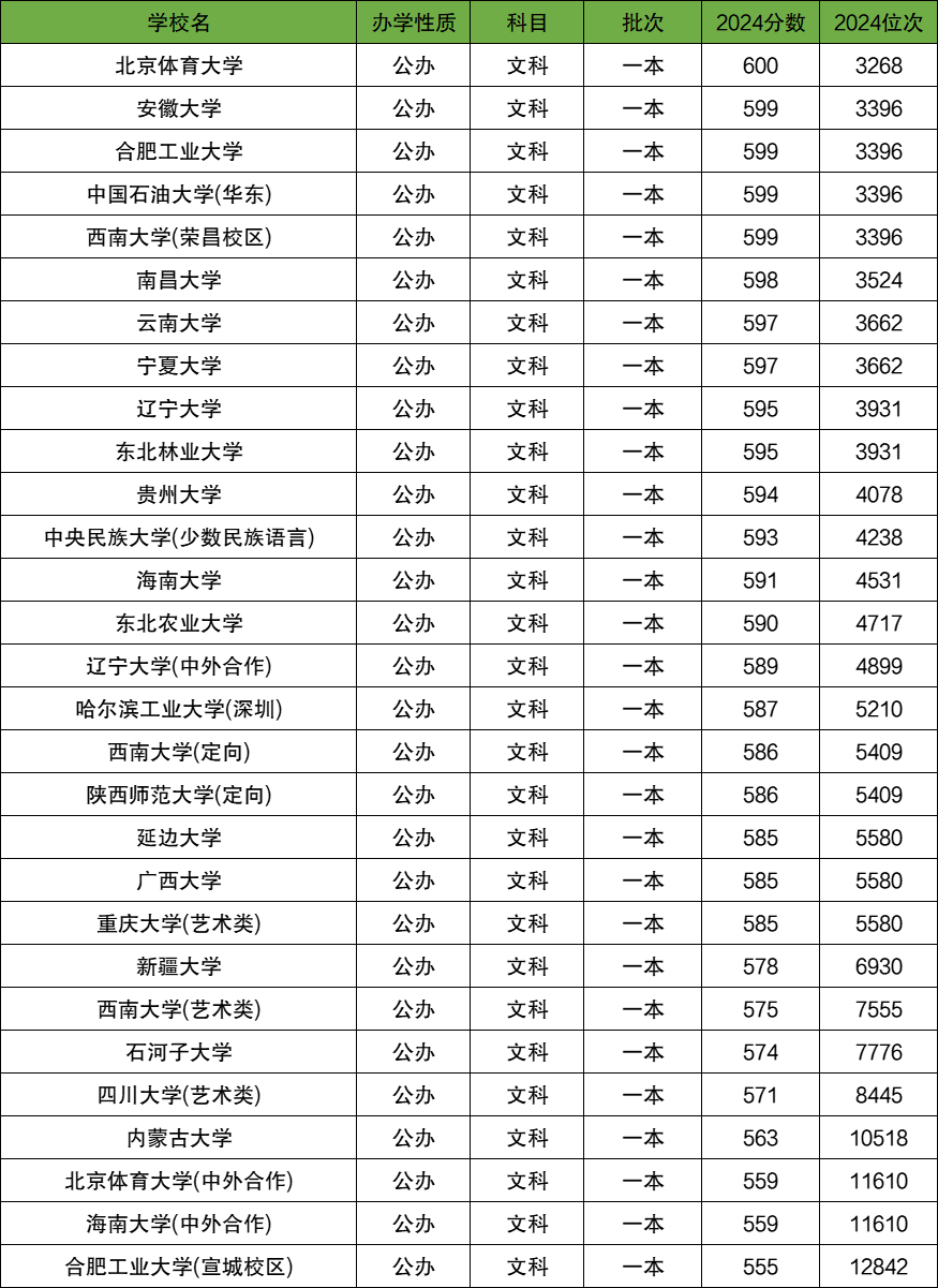 2024年云南省文科一本线为550分。云南文科生超过一本线50分能报考的211大学有北京体育大学、安徽大学、合肥工业大学、中国石油大学(华东)、西南大学(荣昌校区)等。