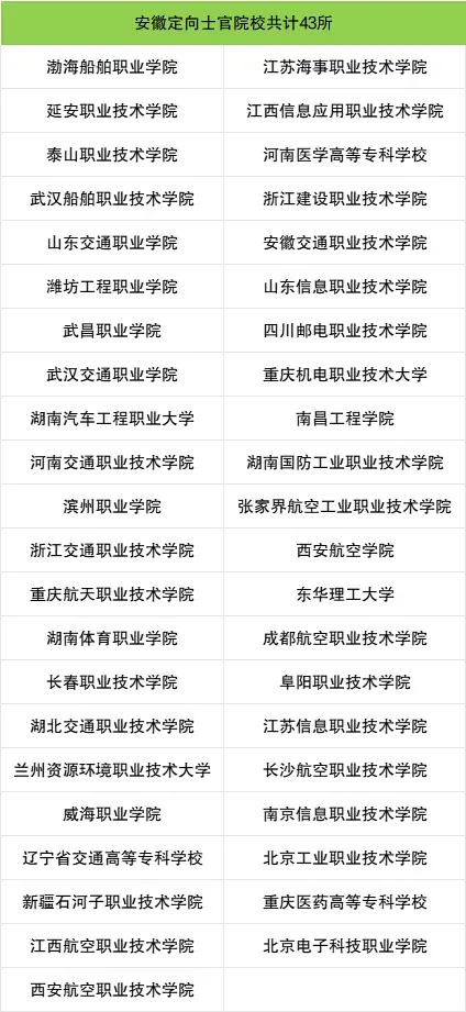 共有43所院校在安徽招收定向士官,其中省内院校有2所,分别为安徽交通职业技术学院、阜阳职业技术学院。