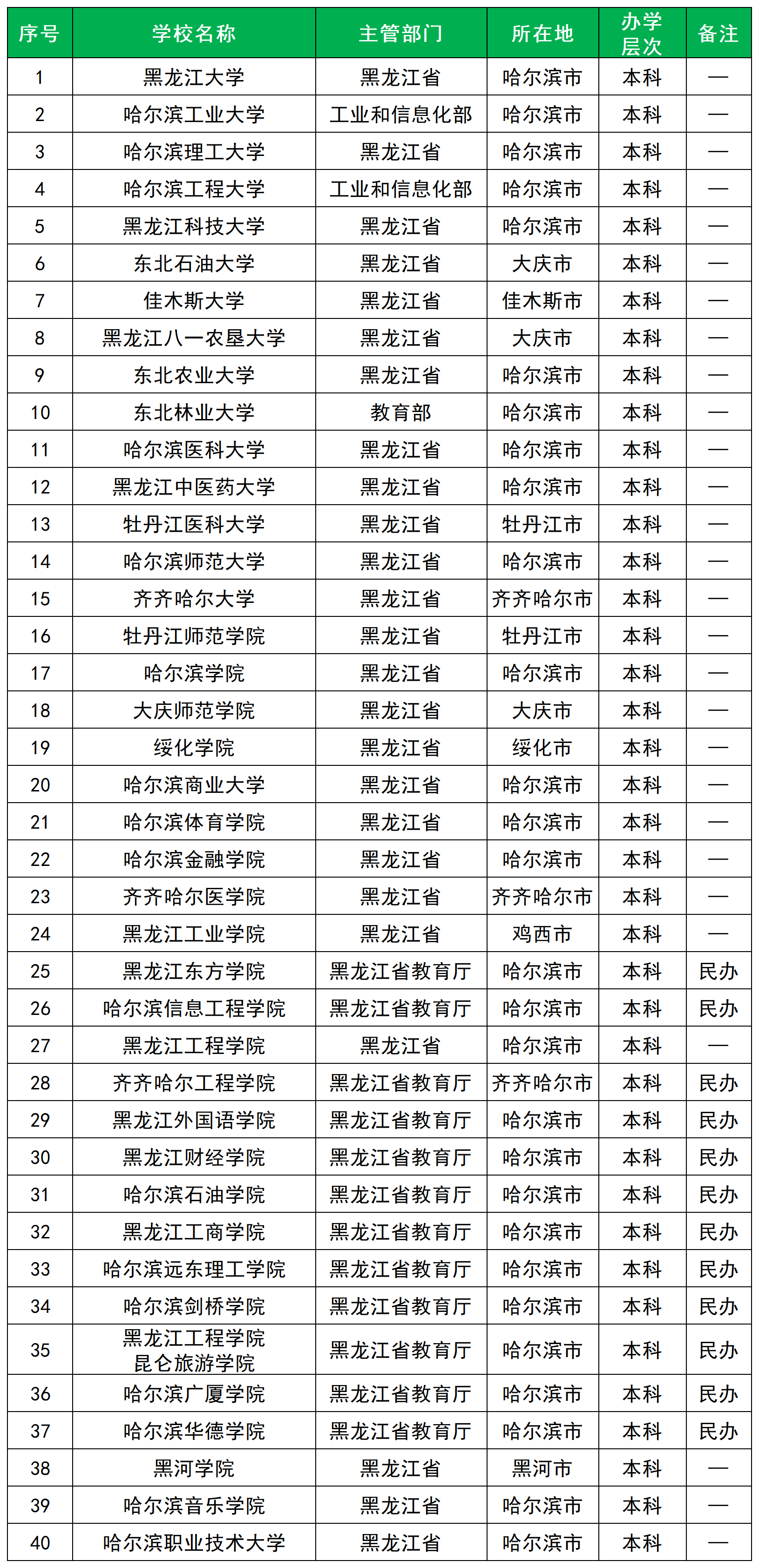 黑龙江省内有40所本科大学,其中知名度较高的大学有哈尔滨工业大学、哈尔滨工程大学、东北农业大学、东北林业大学、黑龙江大学等。